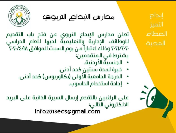 تعلن مدارس الابداع التربوي عن فتح باب التقديم للوظائف الادارية والتعليمية