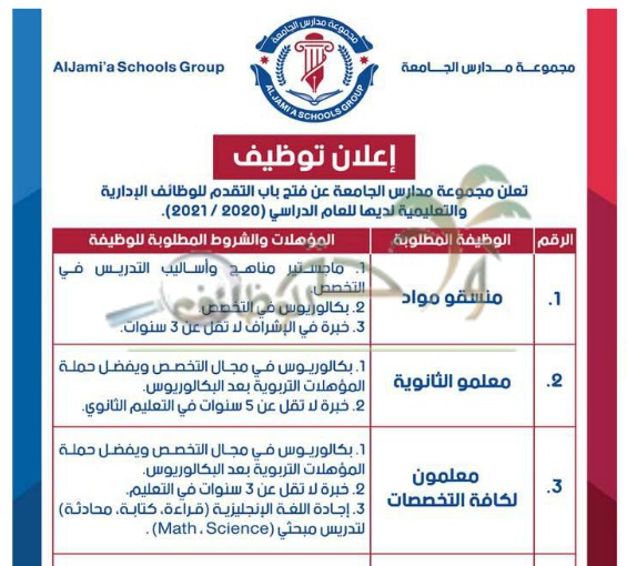 تعلن مجموعة مدارس الجامعة عن فتح باب التقديم للوظائف الادارية والتعليمية لديها للعام الدراسي 2020 2021