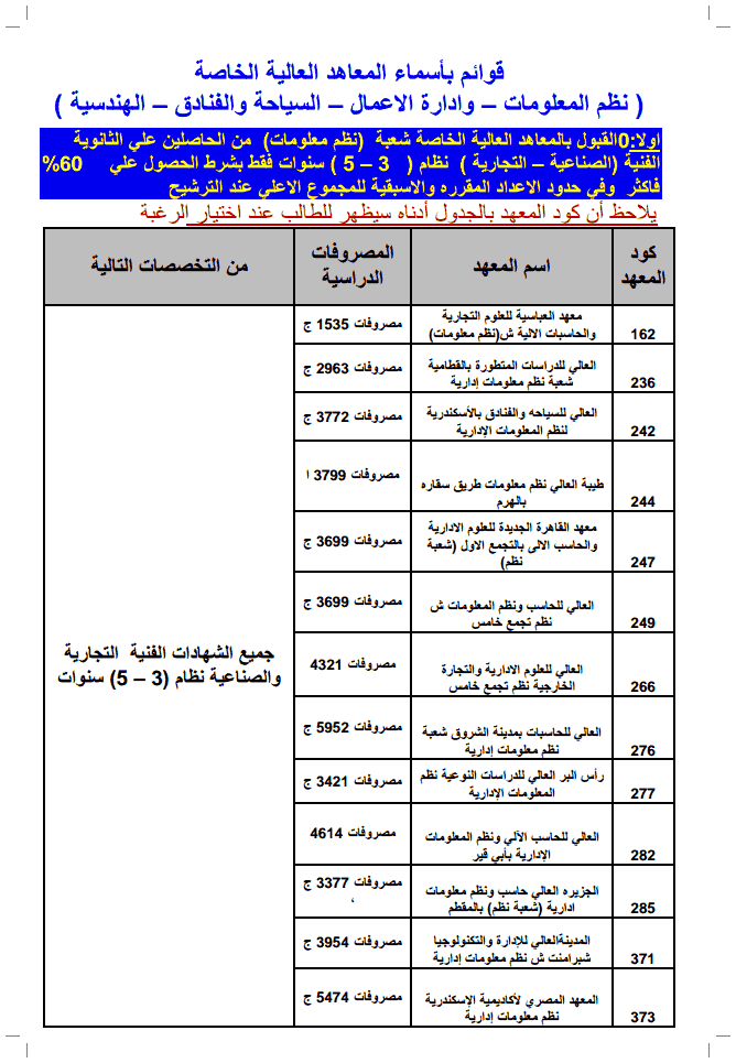 مصاريف المعاهد العليا الخاصة للعام الدراسى 2019 2020 بالتفصيل