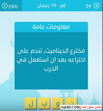 اجابة سؤال مخترع الديناميت تندم علي اختراعه بعد ان استعمل في الحرب من لغز 19 رمضان من لعبة رشفة رم صقور الإبدآع